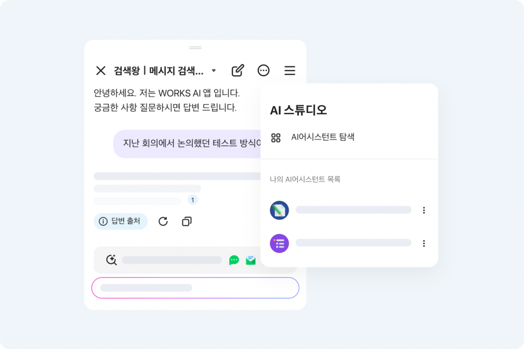 네이버웍스와 외부 데이터를 연동한 우리 기관만의 AI 어시스턴트를 업무 목적별로 손쉽게 생성·활용해 행정 업무의 정확성과 효율성을 극대화할 수 있습니다.