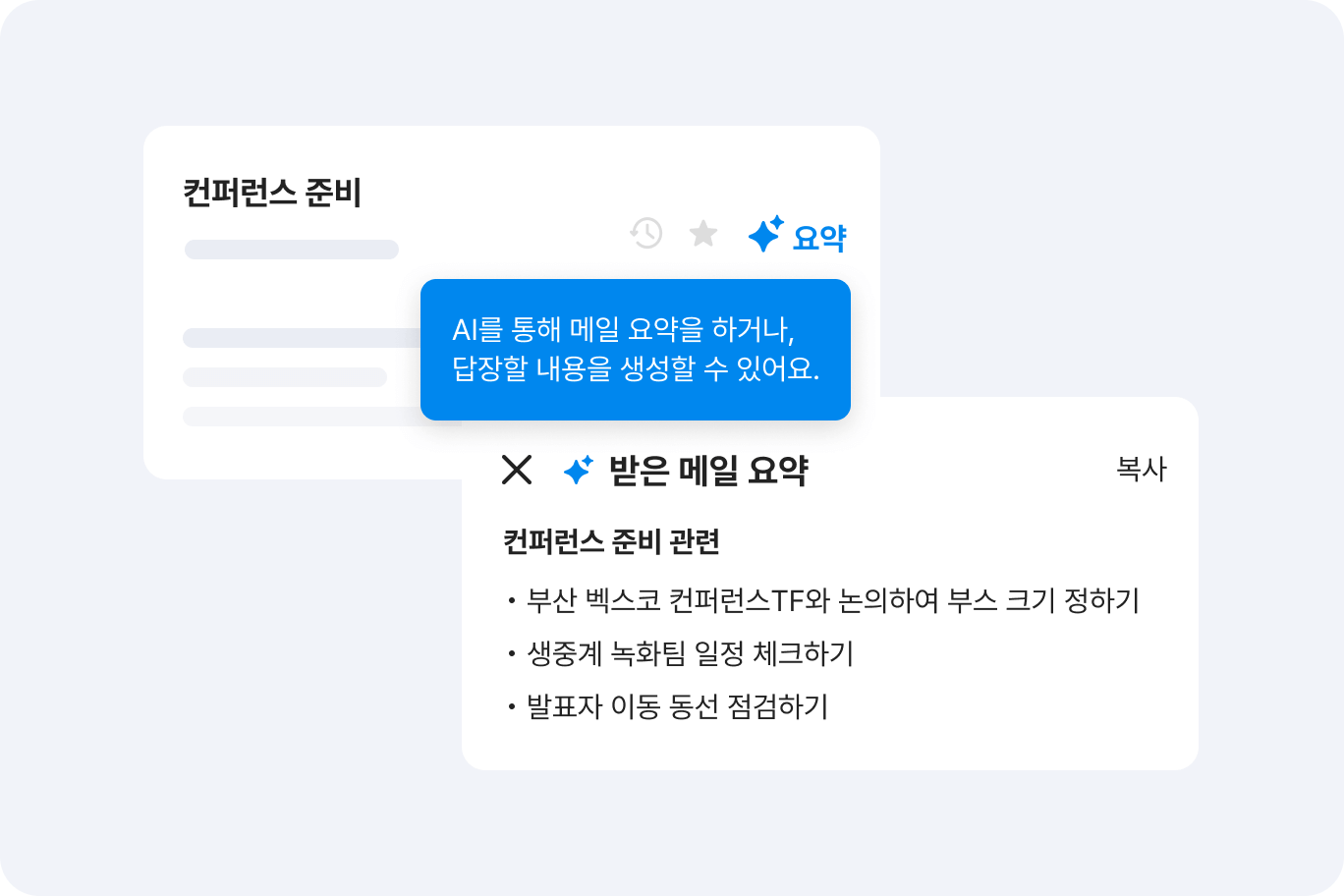 AI가 읽지 않은 메시지를 요약해주고, 몇 가지 정보만으로 이메일 초안을 완성해 드립니다.