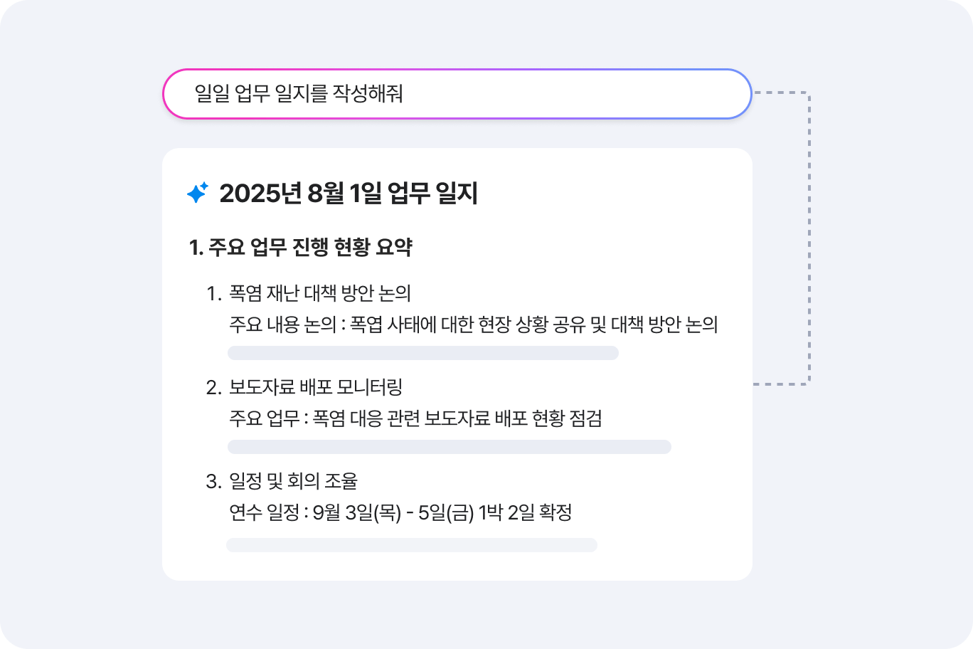 일일 업무보고와 같은 문서 초안을 자동으로 작성해 줄 뿐만 아니라, 후속 업무까지 제안하여 해야 할 일을 놓치지 않고 업무를 이어갈 수 있습니다.